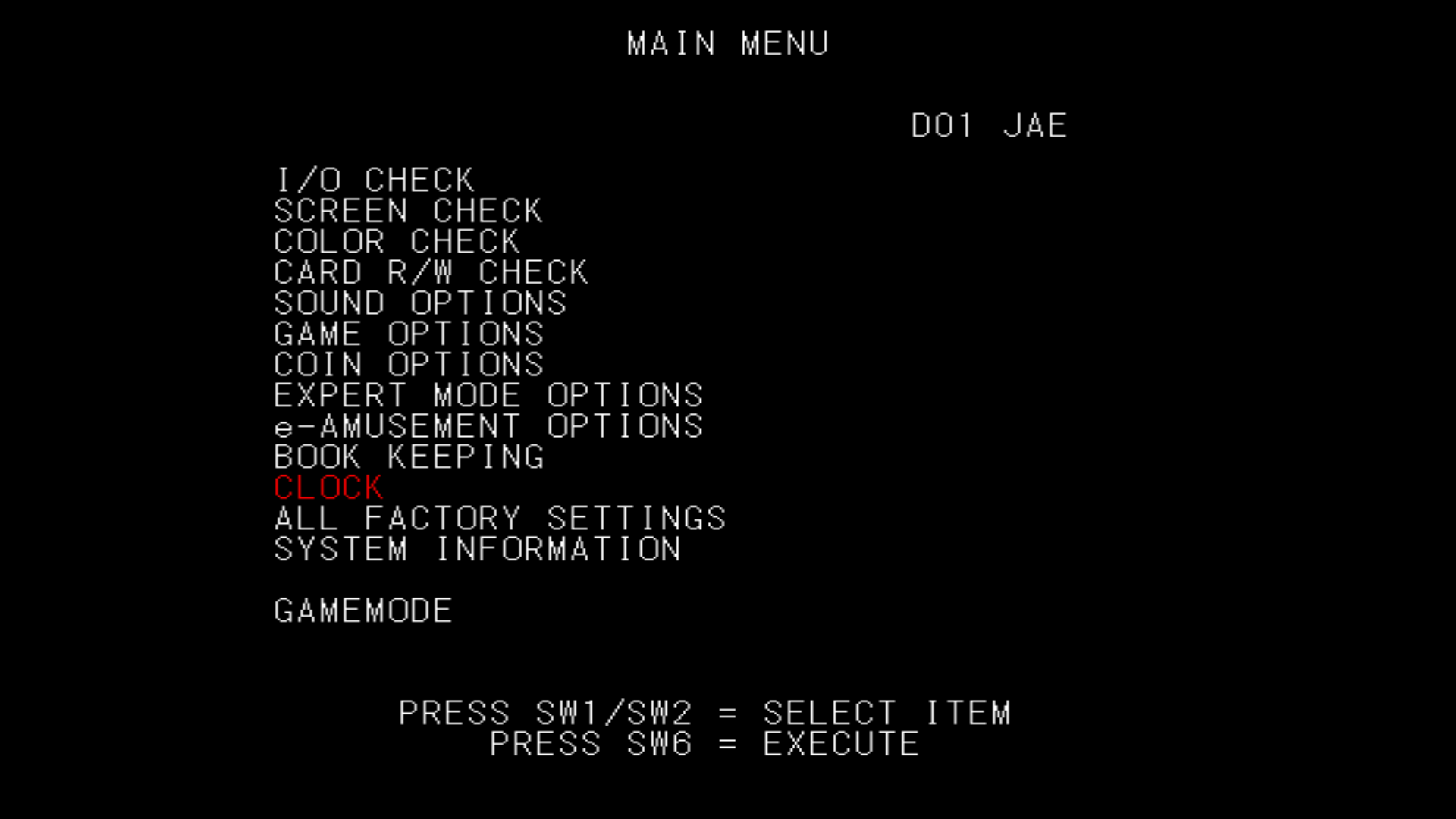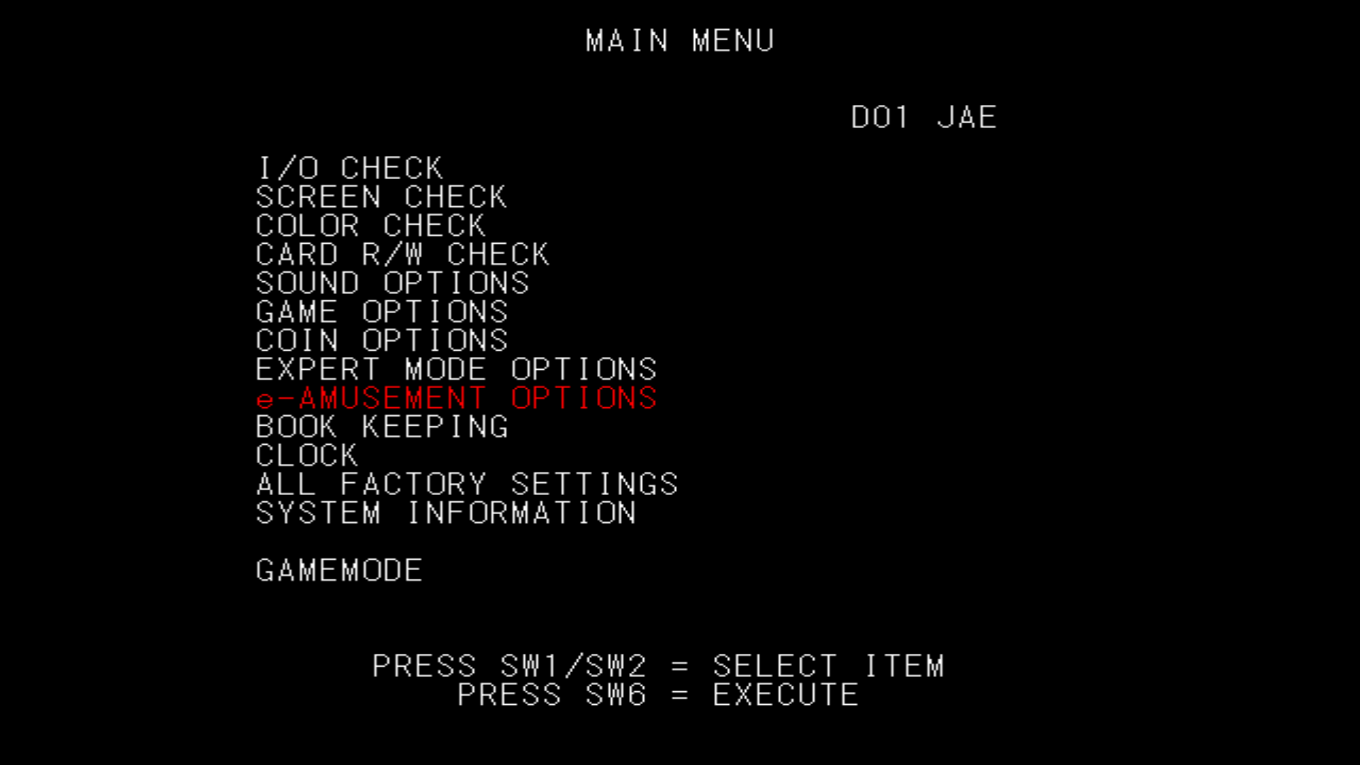From the service menu, go to e-AMUSEMENT OPTIONS then e-AMUSEMENT SETTINGS.