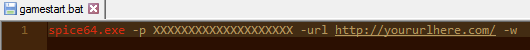 For our online network example we're simply doing the above but with different parameters! On our single line, we're going to type spice64.exe -p XXXXXXXXXXXXXXXXXXXX -url http://yoururlhere.com/ -w and save the file.
