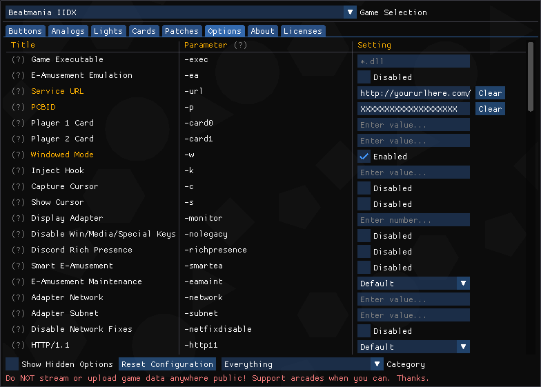 -urlallows you to specify a custom service URL to connect with, simply replacehttp://yoururlhere.com/with your chosen network's URL.-ptakes your PCBID on your network of choice, simply replaceXXXXXXXXXXXXXXXXXXXXwith your PCBID.-wwill boot the game in windowed mode which will ease our initial setup and testing later, make sure to remove-wto run the game fullscreen once you're done setting up!